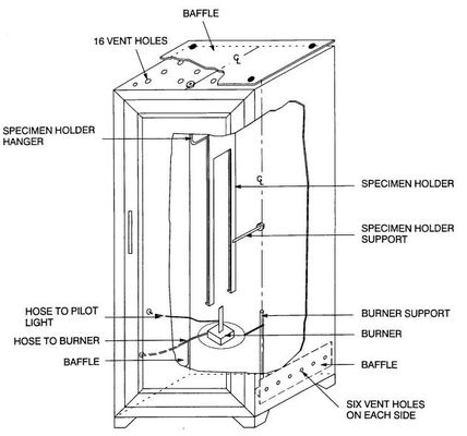 Este aparato se utiliza para evaluar la resistencia a la llama de telas, telas de múltiples capas, ensambles de telas usados en batas y tiendas de campaña.