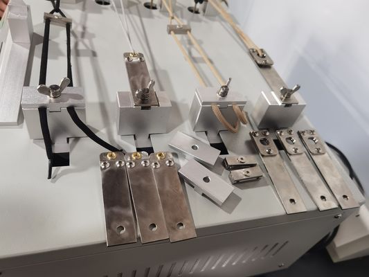 El método de instalación del cordón es el siguiente: tomar dos cordones, enganchar la sección media para formar el derecho y el izquierdo,y utilizar la abrazadera derecha de la máquina (abrazadera móvil) para sujetar los dos extremos del cinturón derecho naturalmente. La distancia es de 25MM, con la ayuda del medidor de muestra, hacer el cinturón derecho gancho el cinturón izquierdo en 52.2°, el punto de gancho está a 120MM de distancia del punto de llegada,y luego sujetar un extremo del cinturón izquierdo con la abrazadera izquierda (abrazadera fija), y colocar el otro extremo en la ranura de la polea, y suspender el peso debajo, la distancia natural entre el punto de pinza y la ranura de la rueda es de 35 ± 5 mm. Durante el ensayo,la abrazadera móvil recorre en línea recta de izquierda a derecha a una velocidad constante, de modo que las secciones medias de los dos cordones se froten entre sí.