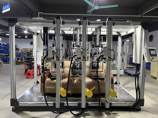 Este probador simula las condiciones normales de uso para determinar la resistencia del sofá bajo una carga repetible a largo plazo.El principio es simular el uso funcional normal para determinar la resistencia de la estructura de tres sofás aplicando cargas a los asientos y respaldos- mediante el uso de módulos de carga de determinada forma y con una forma y una frecuencia específicas, respectivamente, de asientos de carga repetitivos, respaldo de espalda y reposabrazos, y estos tres ensayos pueden realizarse conjuntamente o de forma independiente,también la posición de ensayo es ajustable.