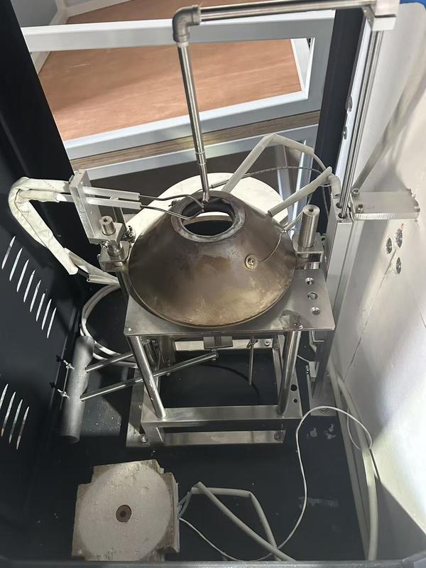 El sistema completo incluye cono de radiación, dispositivo de ignición, boquilla, mecanismo de placa de presión, marco de soporte, registrador de temperatura, sistema de gas y control por computadora.